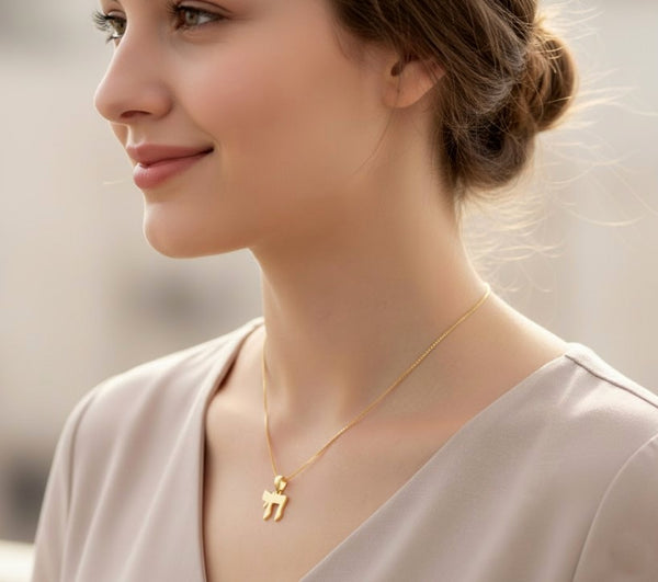 Its refined satin finish with polished edges gives it a timeless glow, perfect for everyday wear or as a meaningful gift. Whether for a Bat Mitzvah, birthday, or simply as a symbol of gratitude and blessing, this tiny gold Chai pendant embodies strength, vitality, and Jewish tradition in every detail.