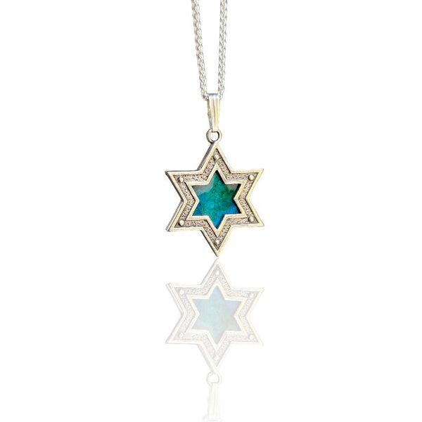 This 925 Sterling Silver Eilat Stone Star of David Pendant is made from the finest sterling silver as indicated with a 925 metal stamp. 100% safe for sensitive skin. Eilat stone is chrysocolla that is intermixed with turquoise and a form of malachite. The mine from which this stone comes has been depleted.