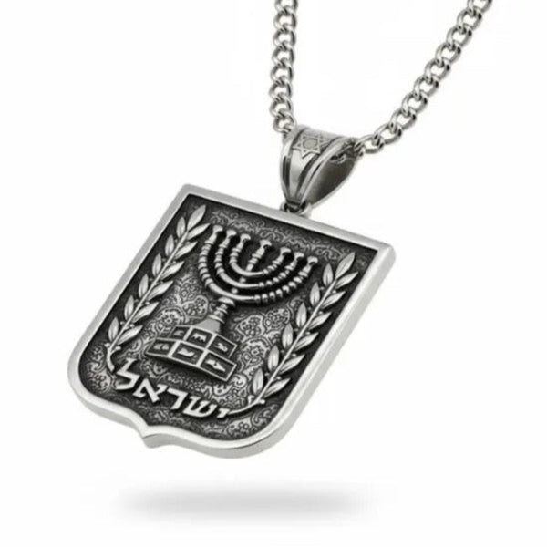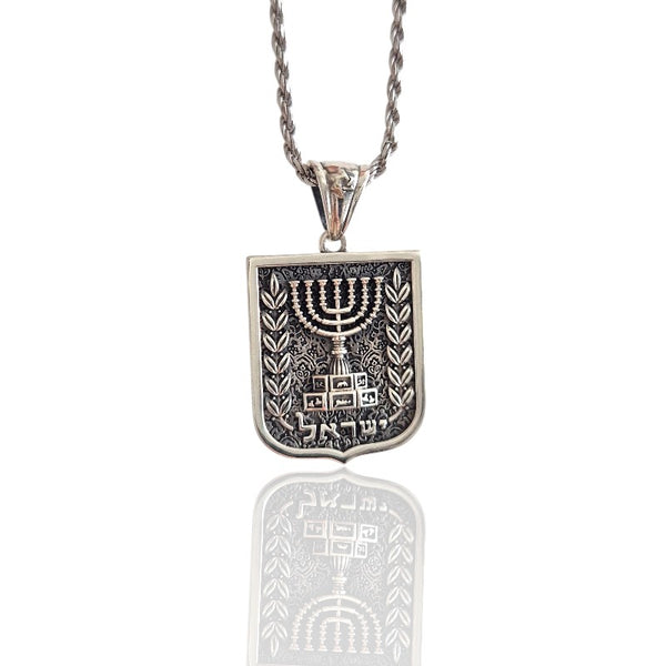 This meaningful pendant features the official symbol of the State of Israel — a seven-branched Menorah flanked by two olive branches, with the word ישראל (Israel) engraved beneath it. The emblem, chosen in 1948, represents peace, faith, and the eternal light of the Jewish people.