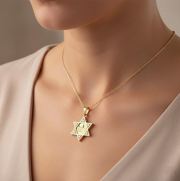 This exquisitely detailed 14K solid gold Star of David pendant beautifully unites faith, heritage, and timeless artistry. Expertly handcrafted in Israel, it captures the essence of Jerusalem — the eternal city of light and devotion.