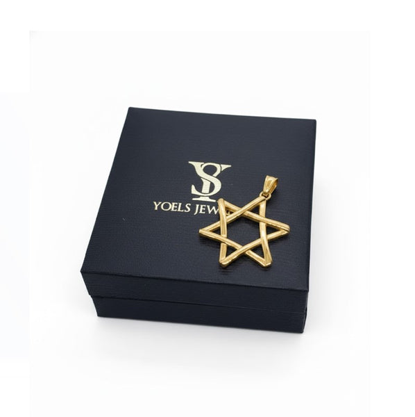 This exquisite pendant showcases a modern twist on the classic Star of David, beautifully crafted in solid 14K yellow gold. The interwoven lines create a graceful, three-dimensional effect that symbolizes unity and faith, while maintaining a sleek, timeless style.