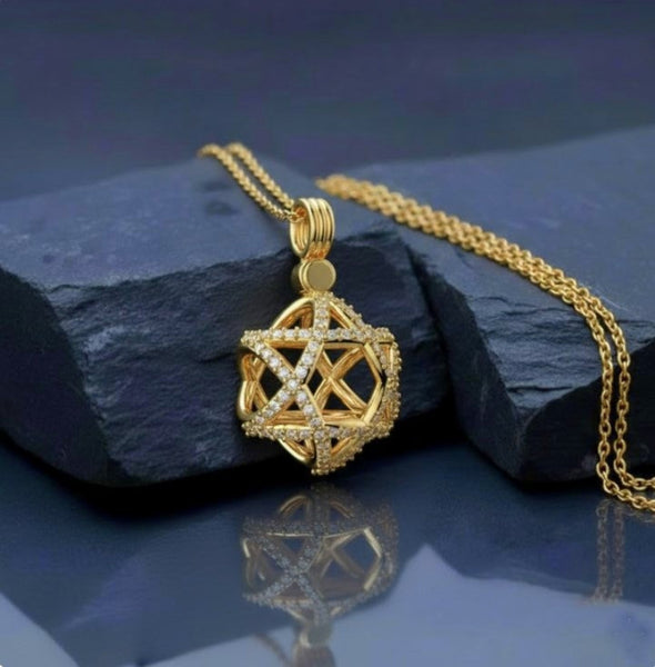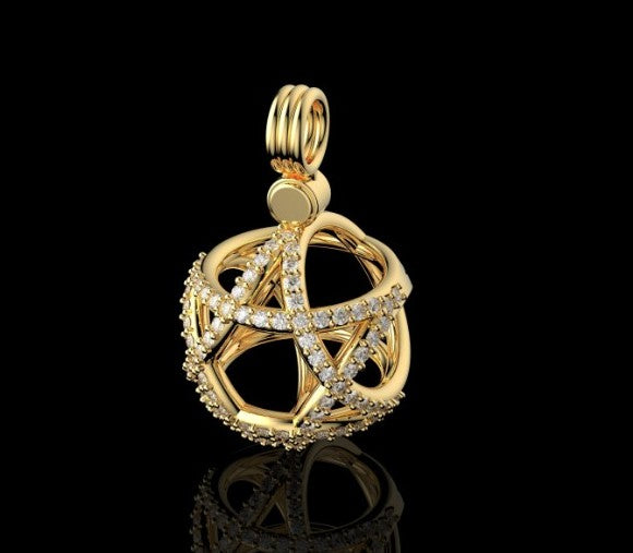 This is not a flat or ordinary design — the bold three-dimensional structure creates depth, movement, and presence from every angle. Light flows through the open framework, reflecting beautifully off the high-polish gold and sparkling diamonds, giving the pendant unmatched brilliance and dimension.