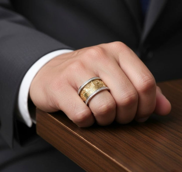 This magnificent and opulent 14-karat gold Jerusalem ring will give your hand a touch of class. This ring is a remarkable masterpiece thanks to the extraordinary craftsmanship, intricate detailing, and design. This handcrafted ring has a thick, wide band made of heavy gold and a shiny, polished Menorah against a delicately brushed background. The menorah Set with with hiqw quality diamonds, adding a nice siny sparkling touch. If you're seeking for something special, this lovely assortment will satisfy your needs.