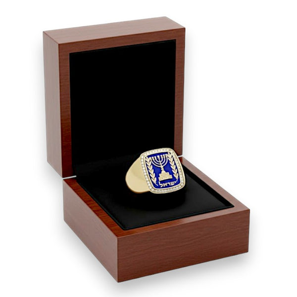 14K Solid Gold Emblem of Israel Signet Ring with Lab Diamonds & Blue Enamel – Handmade in Israel