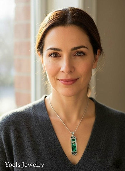 This 925 silver Yemenite filigree Jewish pendant embodies timeless beauty and deep spiritual meaning. Designed in the iconic mezuzah shape, it features a dazzling piece of authentic Eilat stone from Israel as its centerpiece. The rich green and blue hues of the stone serve as a stunning backdrop for the Hebrew letter "Shin," symbolizing one of the sacred names of G-d, skillfully soldered towards the top. Attached with a 17-inch silver chain, this pendant is both elegant and meaningful.