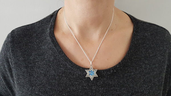 The Star of David, also known as the Shield of David, is a six-pointed star that is a symbol of Judaism. It is named after King David of ancient Israel, who is said to have used a shield with a six-pointed star on it in battle. The Star of David has been used as a symbol of Judaism since the Middle Ages and is a prominent feature of the Israeli flag.Beautiful 925 Silver Roman Glass Star of David pendant with the hammered texture set with colorful roman glass fragment