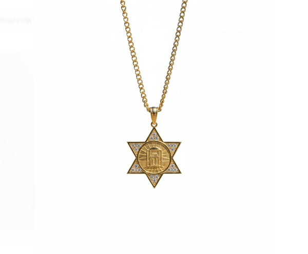 This striking pendant is both lovely and meaningful. The pendant is designed to look like the holy Beit Hamikdash, the temple, that stood on the temple mount in Jerusalem. The detail and likeness are exceptional. The encircled temple is engraved on 36 shiny diamonds studded star.