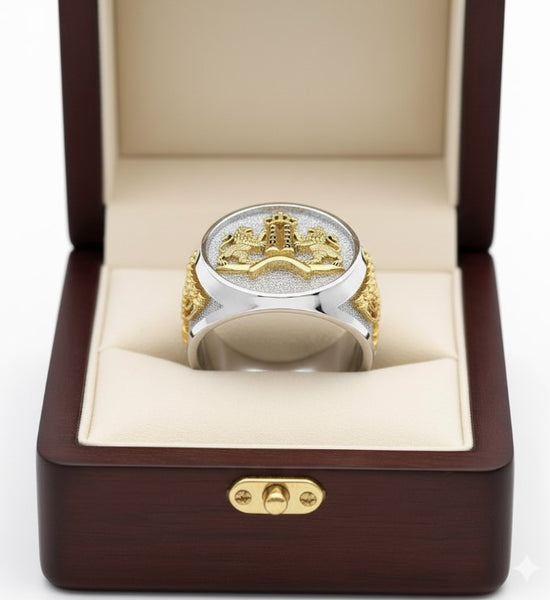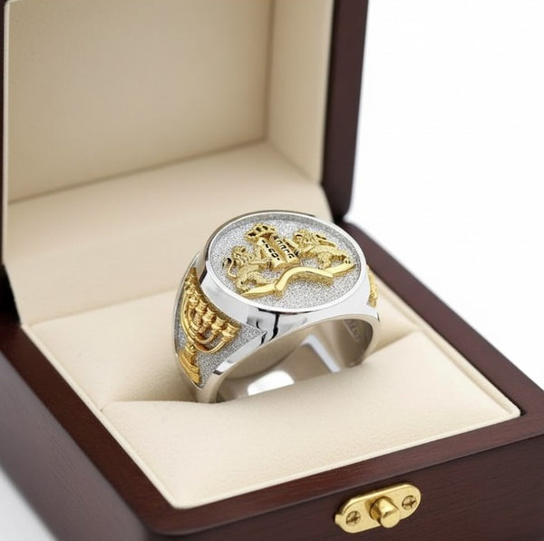 At the center of this masterpiece, the Lions of Judah stand proudly, holding the Ten Commandments and framed by the Jerusalem Wall. The Lions of Judah represent the biblical tribe of Judah, a symbol of strength and leadership, making this ring an enduring emblem of Jewish heritage and identity.